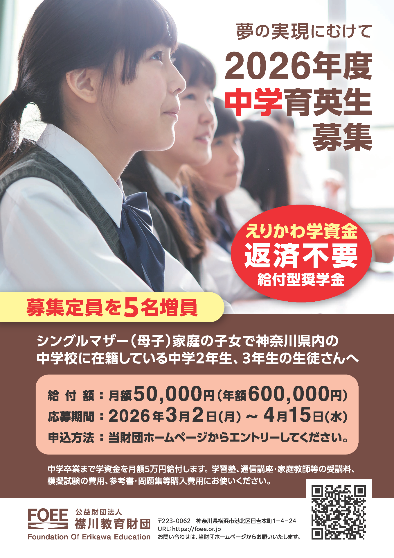 返済不要の給付型奨学金「えりかわ学資金」 2026年度育英生募集要項公開について