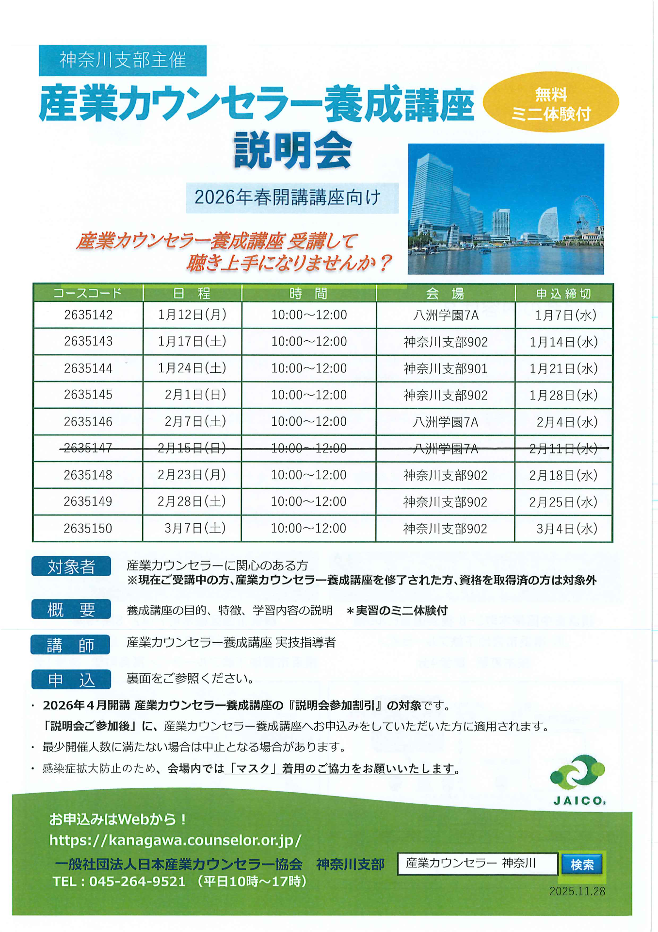 一般社団法人日本産業カウンセラー協会神奈川支部が主催する「産業カウンセラー養成講座」のミニ体験付き説明会。 - 開催日時:令和8年1月12日(月)~3月7日 別紙8回の開催