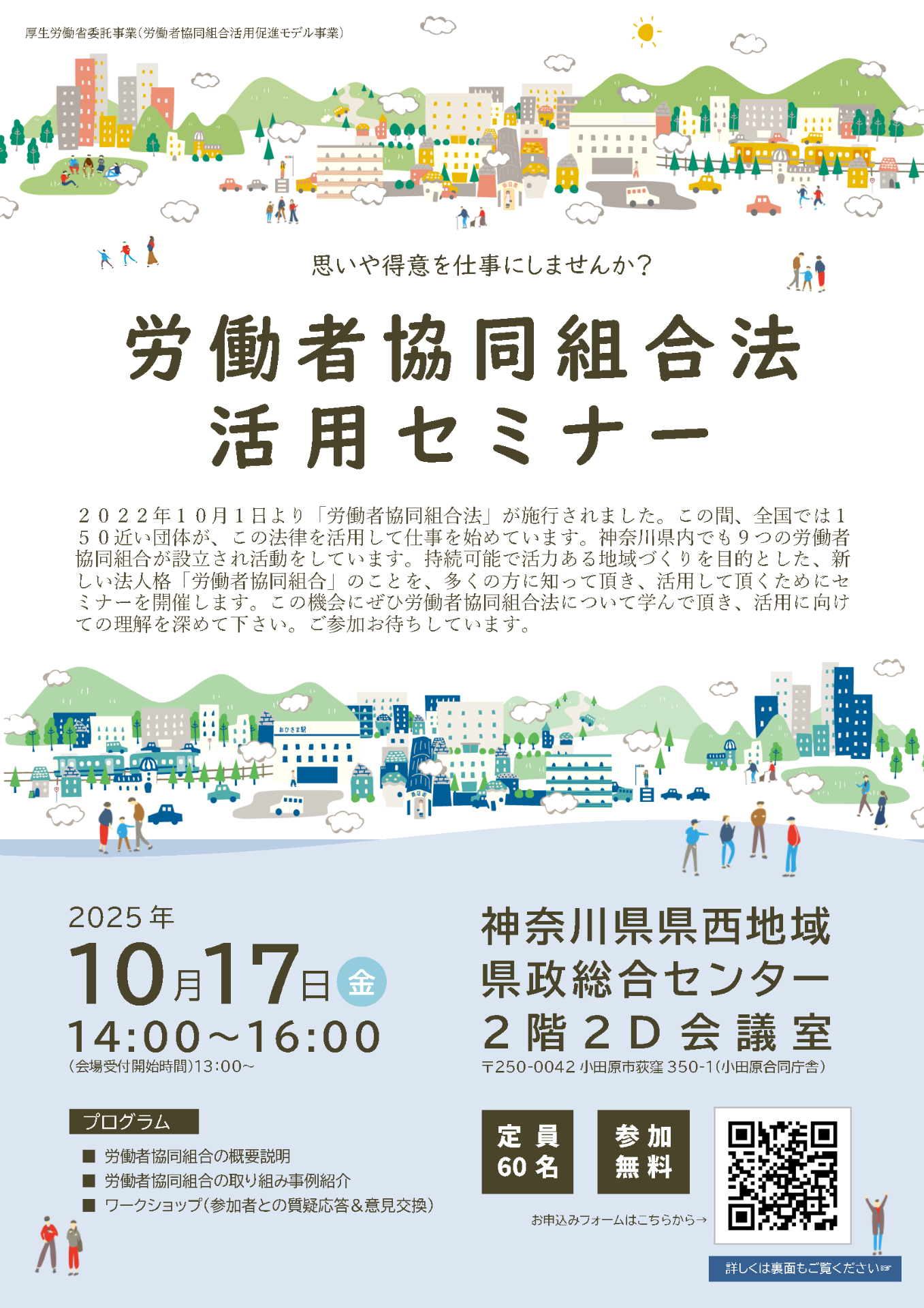 ・神奈川県内での例紹介:活動している労働者協同組合の方から、事例を紹介していただき、労働者協同組合の活動について、参加者に深めてもらいます。 - 開催日時:令和7年10月17日(金) 14時00分~16時00分