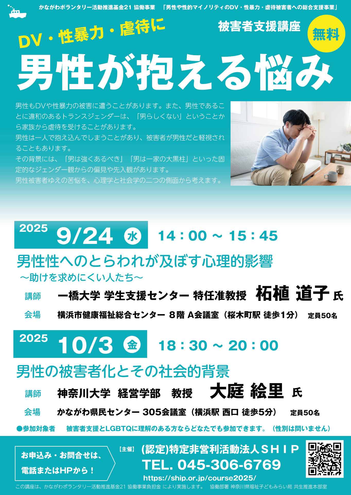 近年、配偶者やパートナーからの暴力(DV)が社会問題となっていますが、被害者のうち男性の割合はこの15年間で1.8%から29.5%に増えています。一時保護所DV被害者の緊急時における一時保護所として、県立女性相談支援センターがありますが、現在の制度では、男性や性自認が男性であるトランスジェンダーのDV被害者の一時保護を行う公的施設がなく、被害者が加害者から避難して、自立を目指せる施設が非常に少ないのが現状です。そのため、当団体では「かながわボランタリー活動推進基金21 協働事業負担金」により、男性や性的マイノリティのDV・性暴力・虐待の総合相談と一時保護所を開設することとなりました。まず、男性被害者が抱える悩みを理解していただくために、被害者支援講座を2回連続で開催することとなりました。 - 開催内容