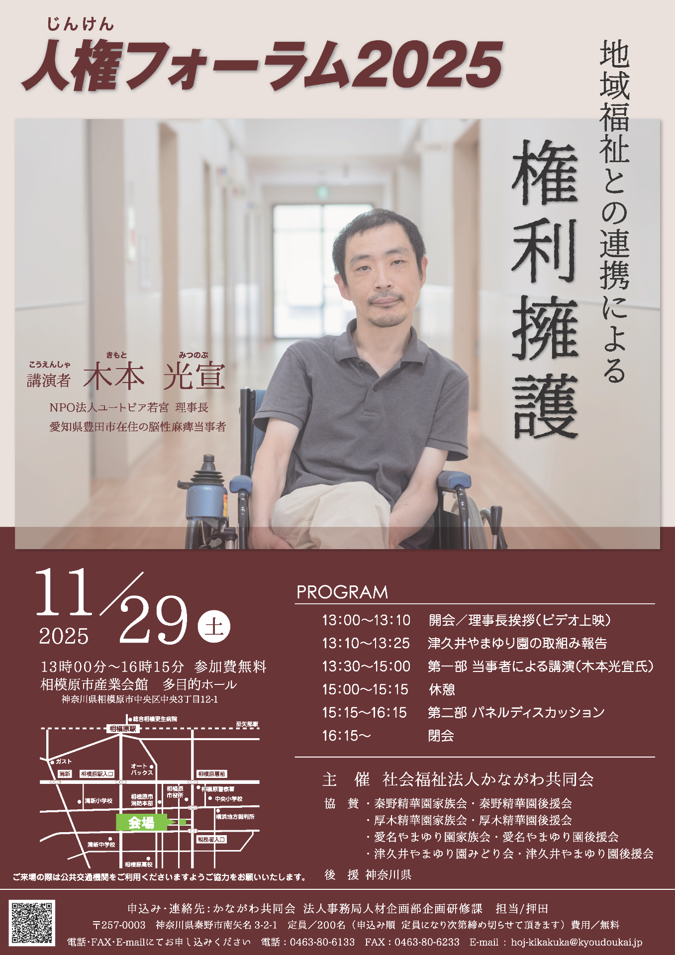 津久井やまゆり園事件の当事者として、すべての利用者の命と尊厳を守る決意を新たに、いかなる偏見や差別も排除し、「ともに生きる社会」の創造に取り組むべく、地域社会における障害者の人権啓発活動および障害者理解を促進し、地域社会の「支えあい」を推進することを目的として、この度、「地域福祉との連携による権利擁護」をテーマとした【かながわ共同会人権フォーラム】を開催いたします。 - 開催内容