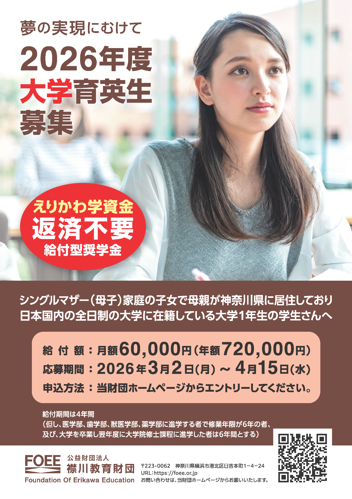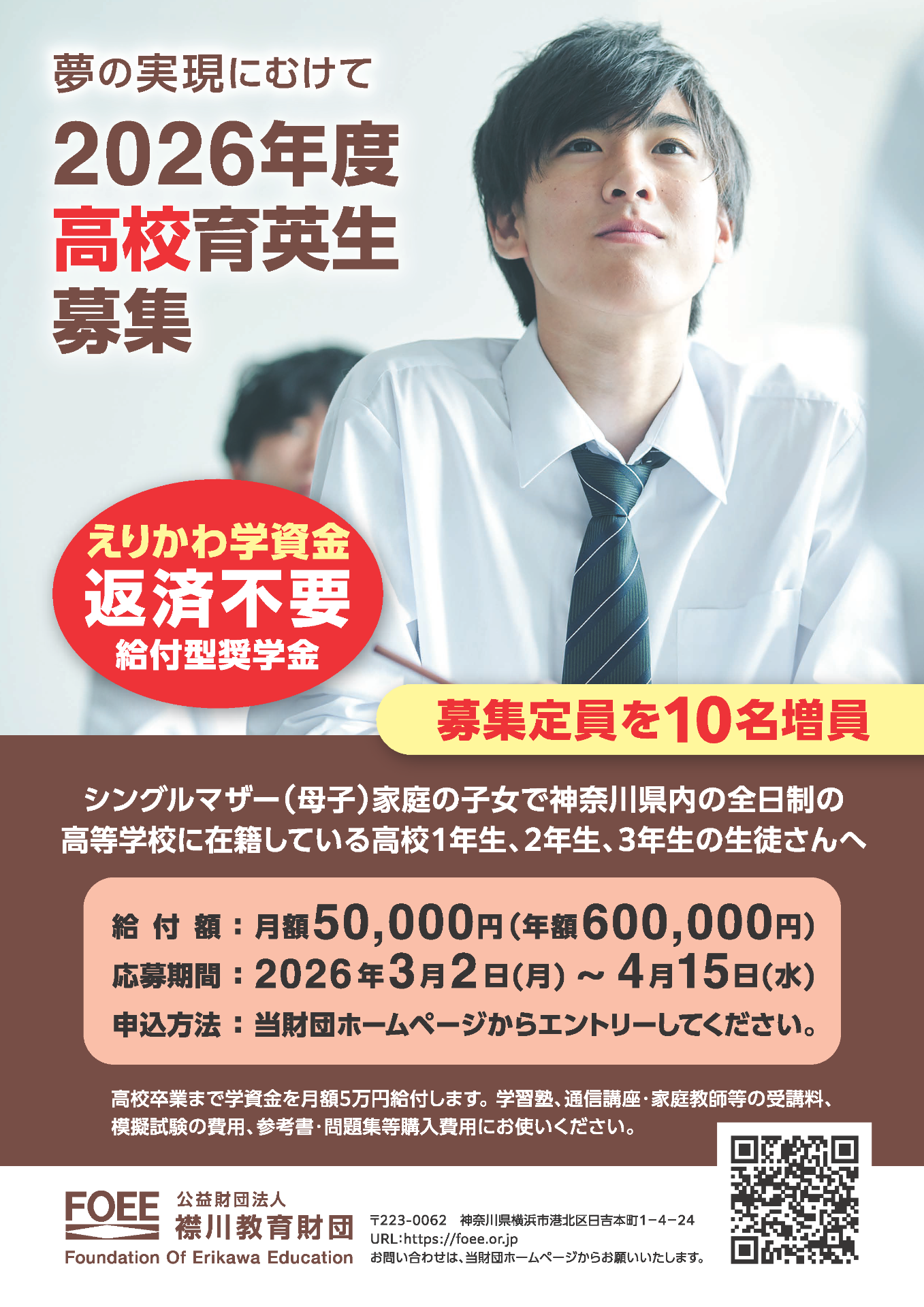 返済不要の給付型奨学金「えりかわ学資金」 2026年度育英生募集要項公開について