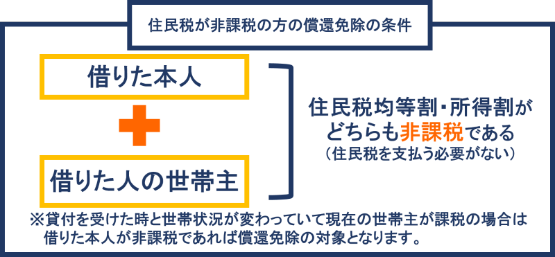 借受人(借りた本人)と借受人の世帯主の両方が「住民税均等割と所得割」どちらも非課税(住民税を支払う必要がない)場合は償還免除(お金をかえす必要がなくなる)になります。